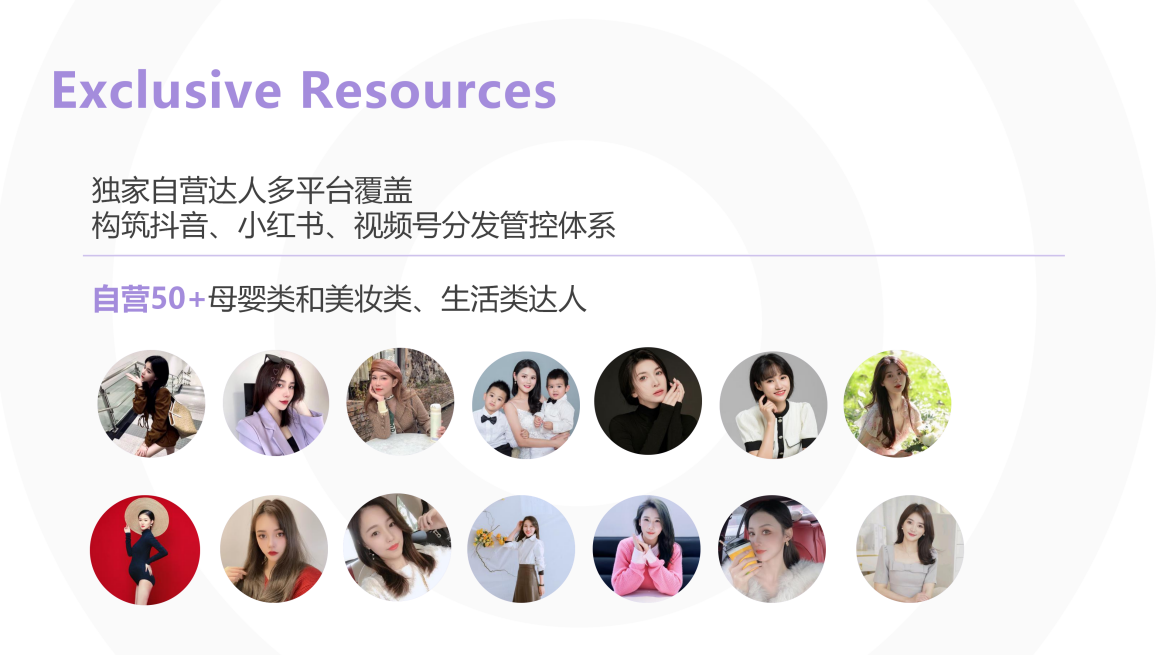 依托200 + 独家 / 签约自营达人与海量优质达人资源,其中5W + 合作带货达人、3W + 月销 2 万 + 优质达人,可精准匹配品牌需求,通过达人种草、社群投放、直播电商等多元形式,直击品牌销售瓶颈,高效提升电商转化与运营效果。